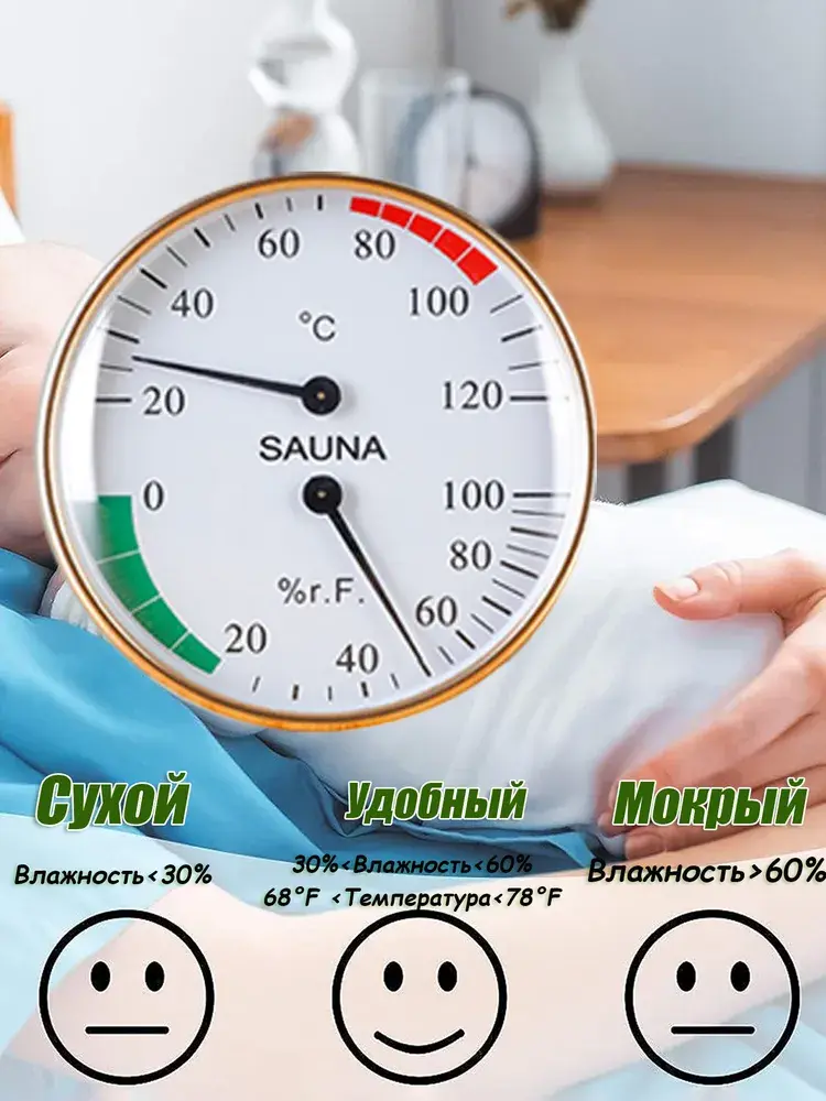 Чтобы банный термометр-гигрометр прослужил вам как можно дольше, устанавливайте его на расстоянии не менее 2 метров от нагревательных элементов и входных дверей.