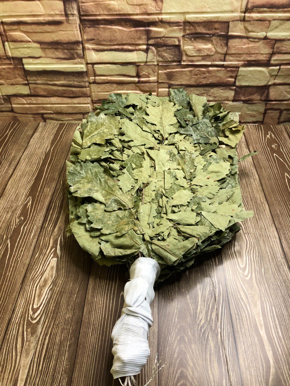 Дубовый веник массажный больше подходит для профессиональных банщиков. Веник очень гибок, легкий. Ручка веника перемотана белой тканевой резинкой.