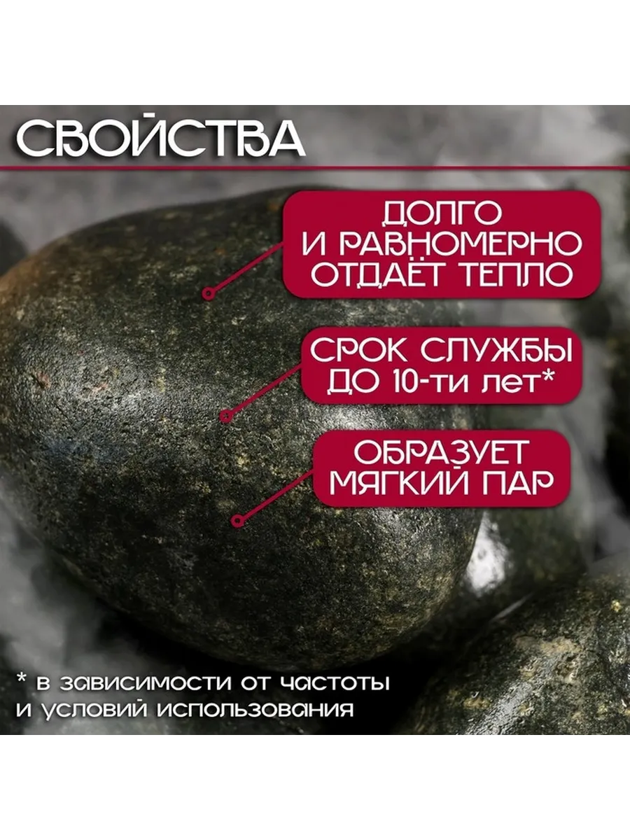 Считается, что оливин нормализует давление, благотворно влияет на работу сердечно-сосудистой системы, помогает справиться с простудными заболеваниями. В процессе обваловки выбраковываются камни с внутренними трещинами, поэтому в комплект попадают только качественные камни.Как укладывать камни для бани Перед началом работы тщательно промойте их. Внизу выложите крупные камни, а мелкие разместите сверху. Для хорошей теплоотдачи и свободного выхода пара не укладывайте их слишком плотно. Чтобы было больше пара и камни не повреждались, обливайте их только горячей водой. Периодически осматривайте кладку и заменяйте треснувшие элементы на новые. Камни различных пород можно сочетать друг с другом.