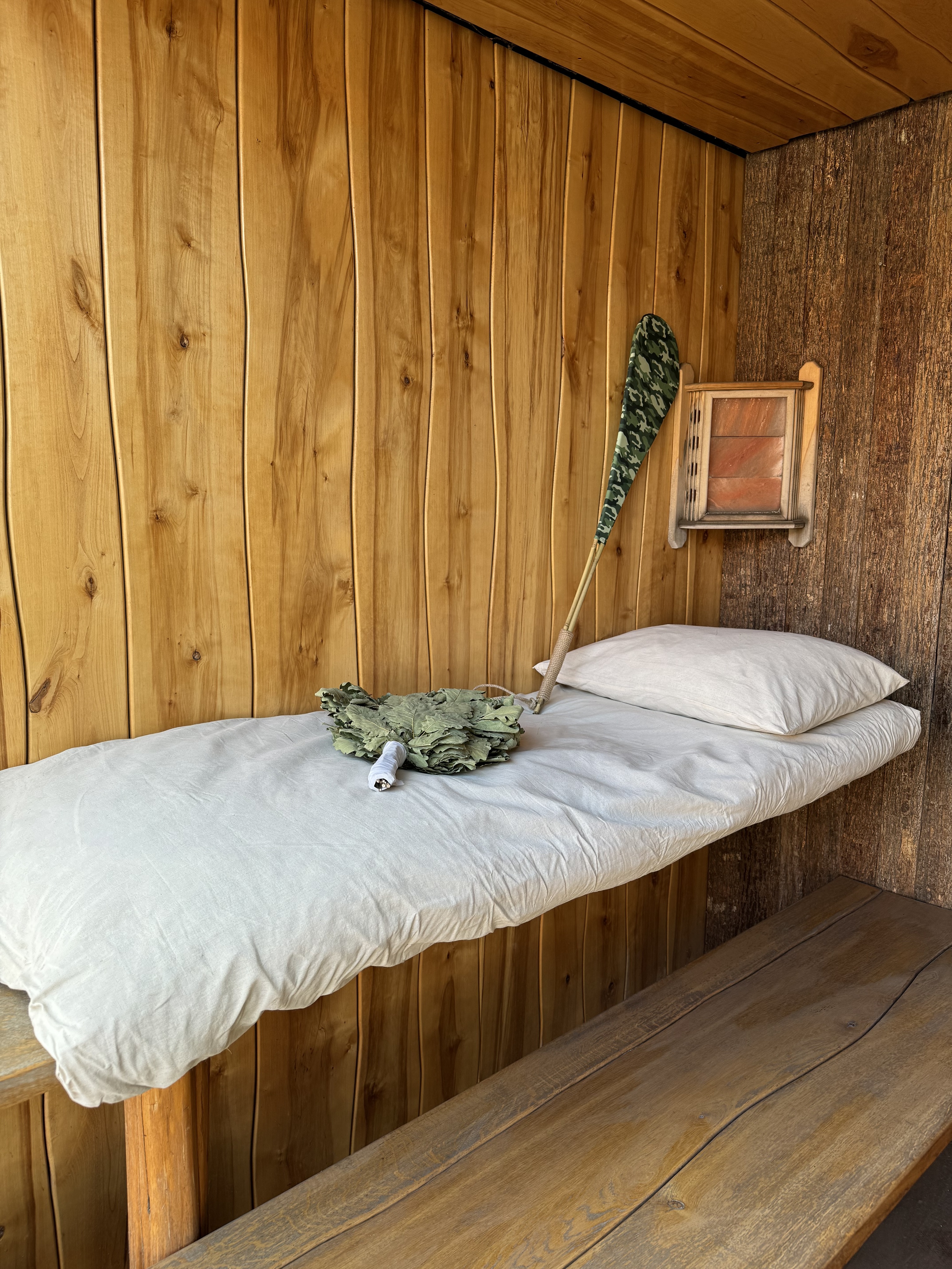 На этапе прогрева бани, расстелите матрас на лавке, и к моменту первого захода,парная наполнится запахом луговых трав.