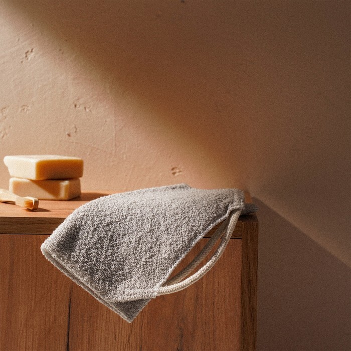 - Натуральные материалы: сочетание хлопка и полиэстера обеспечивает мягкое, но эффективное очищение кожи, деликатно устраняя ороговевшие клетки и стимулируя кровообращение.