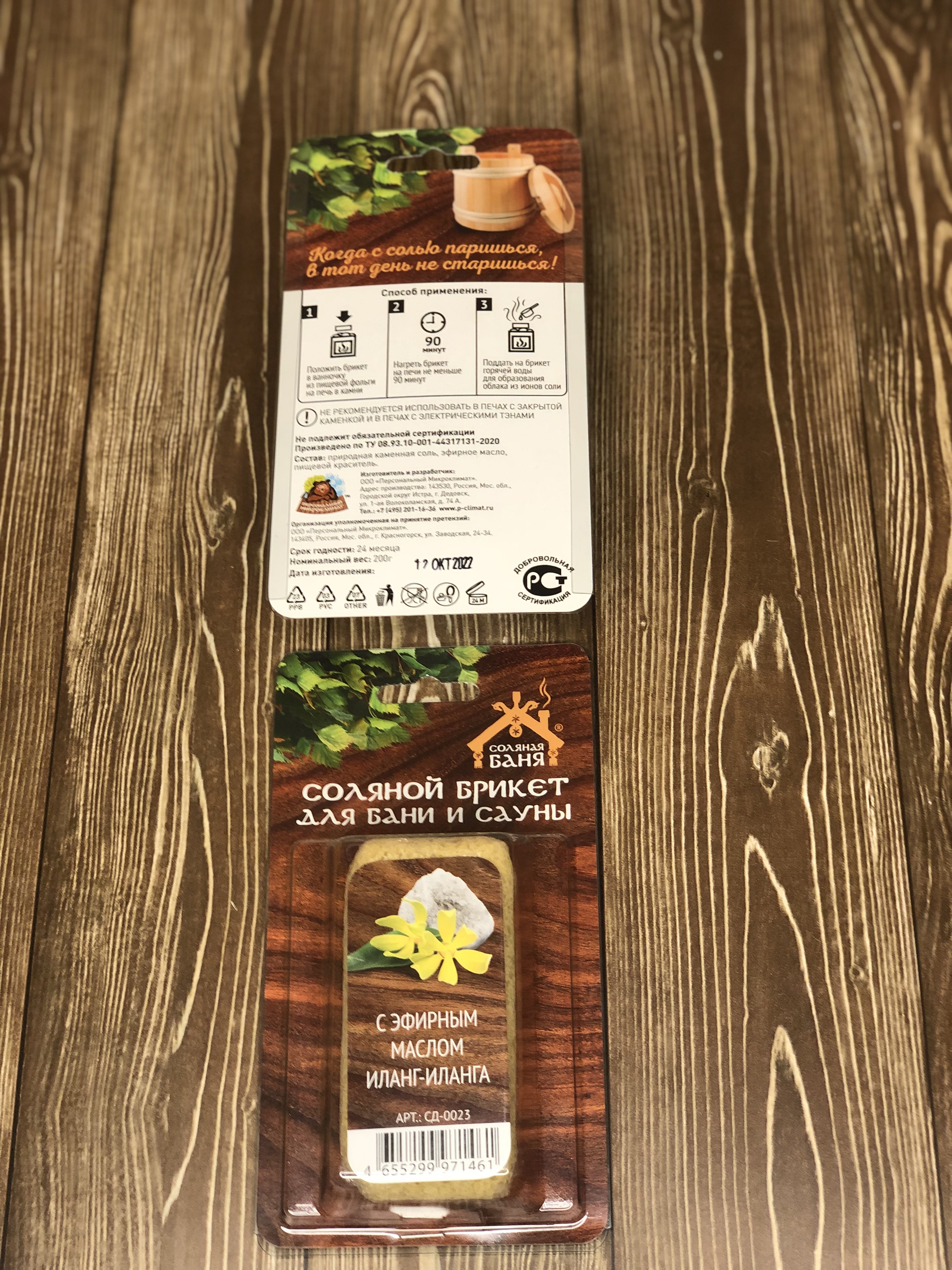 Соляной брикет с эфирным маслом иланг-иланга поможет создать атмосферу богатых и глубоких цветочных ароматов - сочетание жасмина и нероли, что сделает парную процедуру не только полезной, но и весьма приятной.