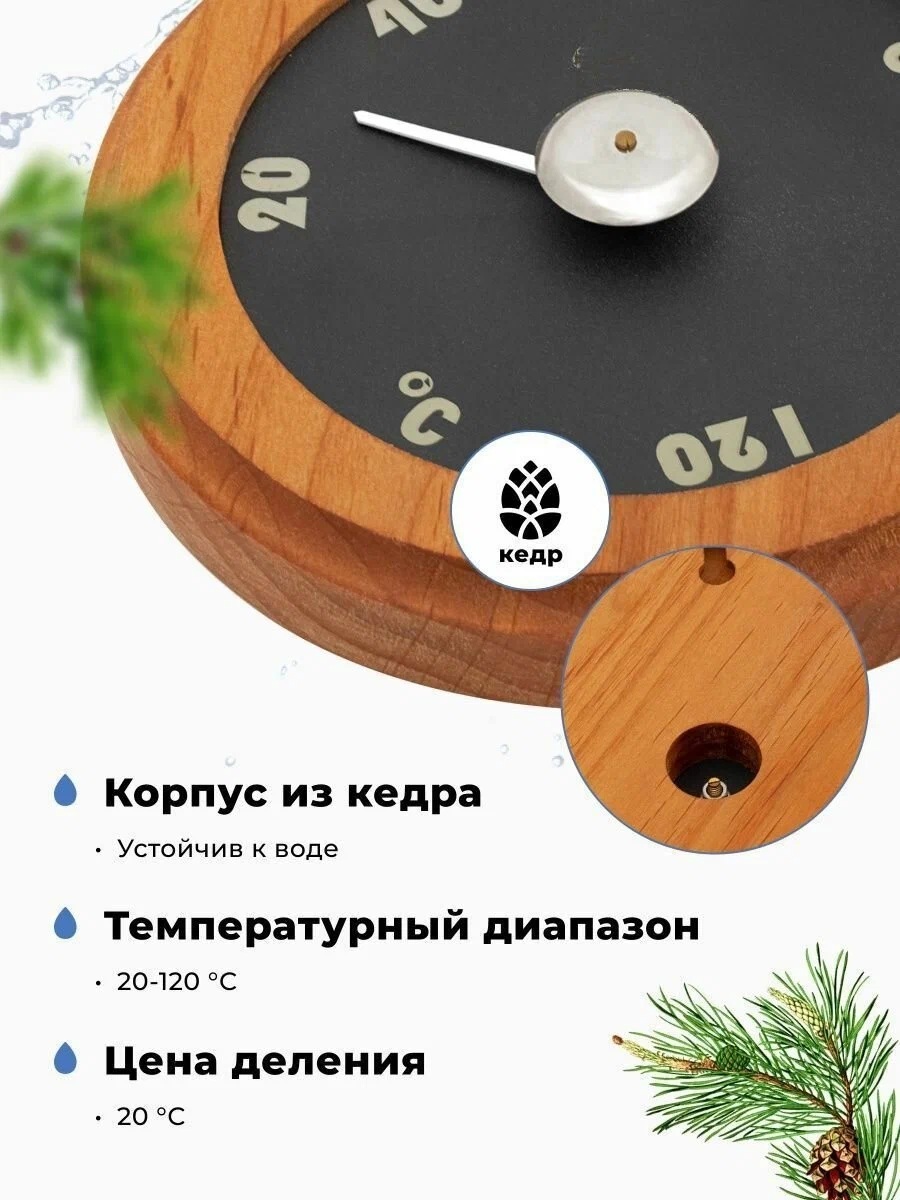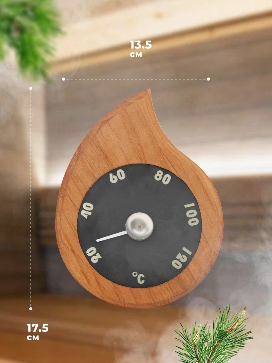 Термометр для бани и сауны, "капля". Диапазон измерения температуры от +20 до +120°С. Точность измерений ± 3 градус. Используется в помещениях различного назначения. Выполнен из натуральных материалов, имеет компактный размер и благодаря приятному дизайну впишется как в интерьер обшитой древесиной парилки сауны или бани, так и любой другой жилой комнаты в доме. Изделие обладает высокой влагостойкостью и жаропрочностью, долгим сроком эксплуатации.