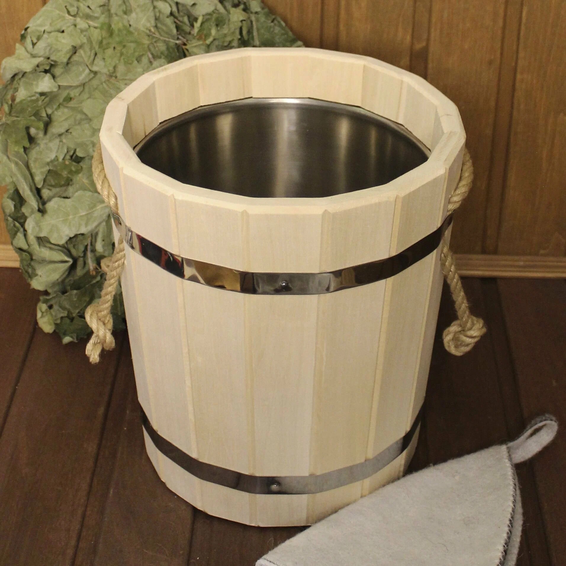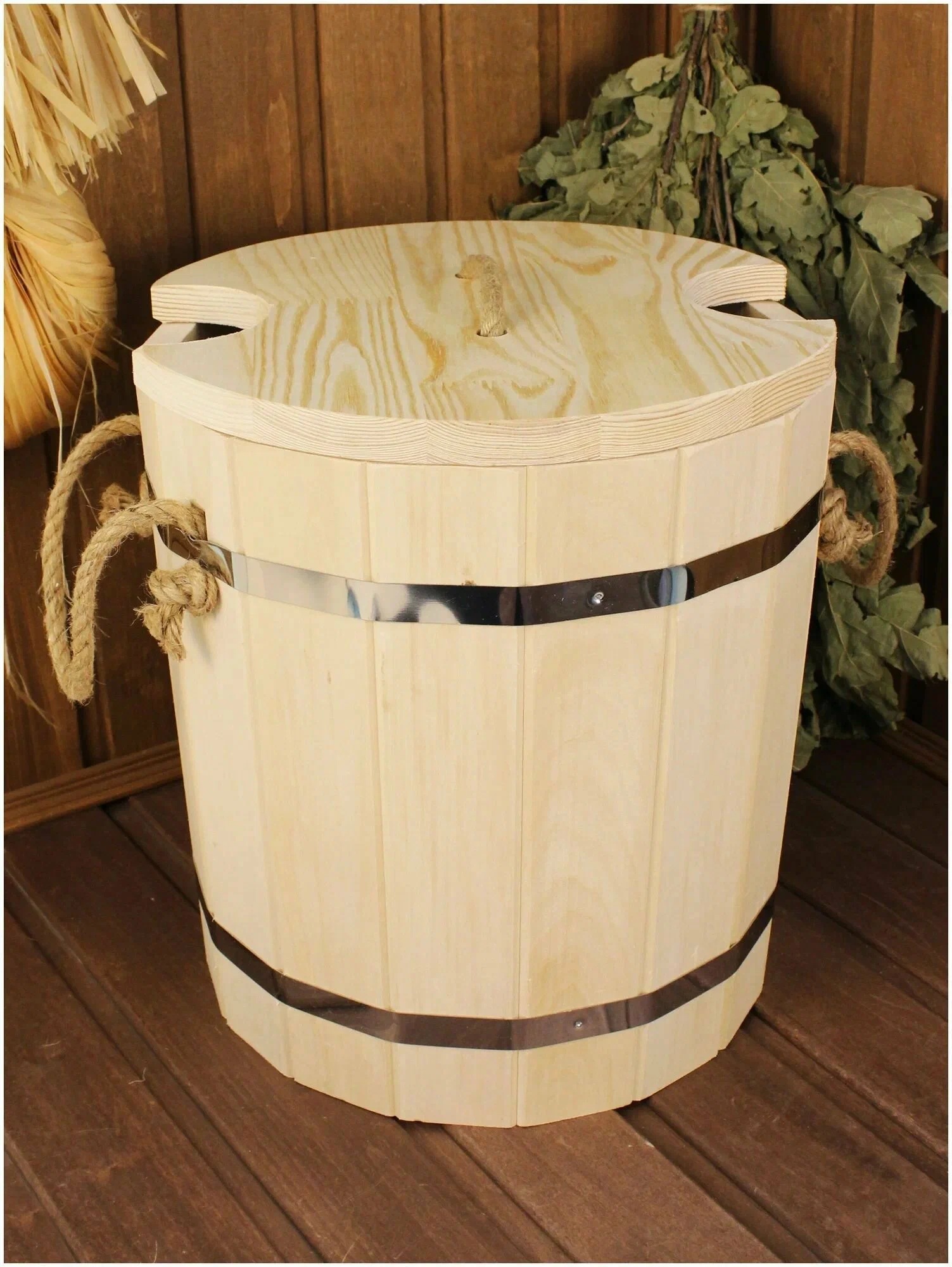Для изготовления ёмкости запарника использована отборная древесина липы и обручи из нержавеющей стали. Детали конструкции собраны бондарным способом, без клея, чтоб делает изделие экологически чистым, прочным и долговечным. Запарник предназначен для распаривания банного веника перед его применением. Наибольший эффект достигается в закрытом запарнике с крышкой, которая идет в комплекте с запарником. Она не дает воде быстро остывать, не позволяет всплывать венику, - и тогда он весь погружен в воду и пропаривается полностью, раскрывая в наибольшей степени свои полезные свойства. Вставка из нержавеющей стали предотвращает протекание ёмкости, ввиду чего запарник можно использовать сразу, не прибегая к его предварительной подготовке, как в случае с чисто деревянным, когда требуется время для набухания древесины, чтобы закрыть мелкие щели между клёпками. Кроме того, металлическая вставка существенно продлевает срок службы изделия.